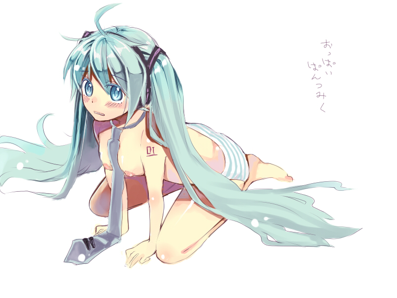 Tags: aqua eyesaqua hairbarefootblushbreastsfeetfemaleheadphoneslong hairnecktienipplespantiesstripedstriped pantiestied hairtoplesstwintailsunderwearvery long hair