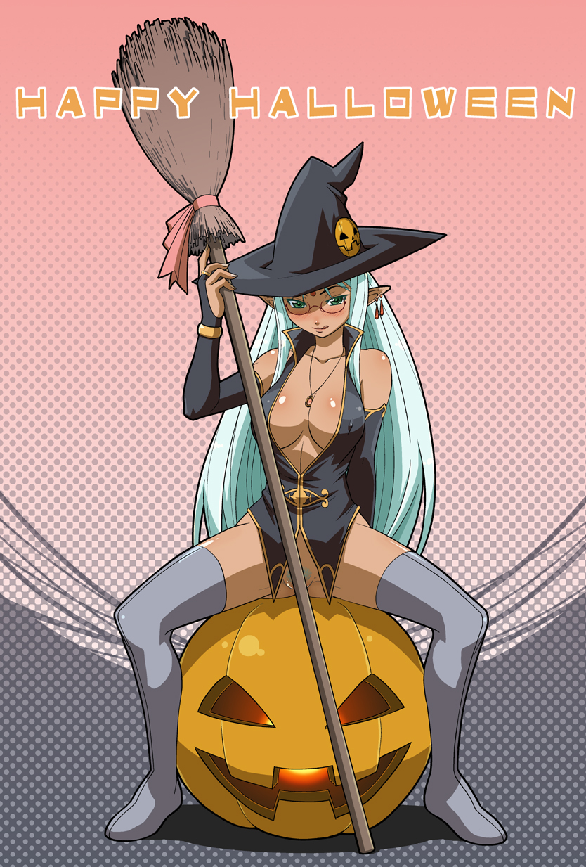 Tags: 1girlsblushbreastsbroomcleavagedark skindetached sleevesfemaleglassesgradientgreen eyesgrey backgroundhappy halloweenhatjack-o'-lanternlong hairno pantiesnudepartially visible vulvapink backgroundpointy earspubic hairpumpkinpumpkin hair ornamentpussysittingsolospread legsthighhighsvery long hairwitch hat