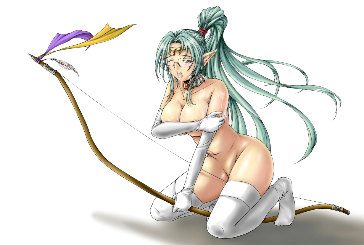 Tags: blushbow (weapon)breastsbukkakechokercircletcumelbow glovesfemaleglovesgreen hairkneelinglarge breastslong hairnudepointy earsponytailthighhighstied hairweapon