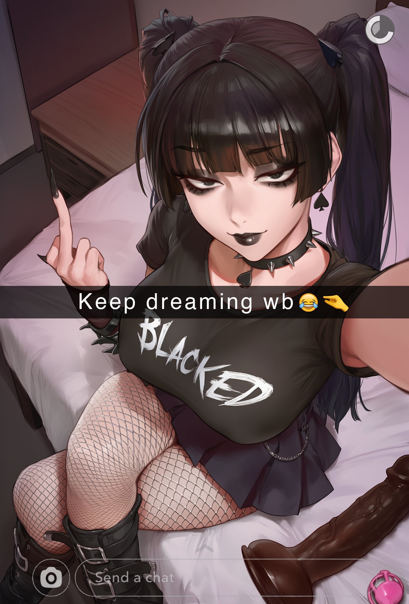 Tags: 1girlsbig breastsblack hairblacked clothingclothedclothingcollardildofemalefemale focusfemale onlyfishnetsgothgoth clothinggoth girllarge breastslight skinlight-skinned femalelipsticklong hairlooking at viewermiddle fingerselfiesex toysolosolo femalethick thighs