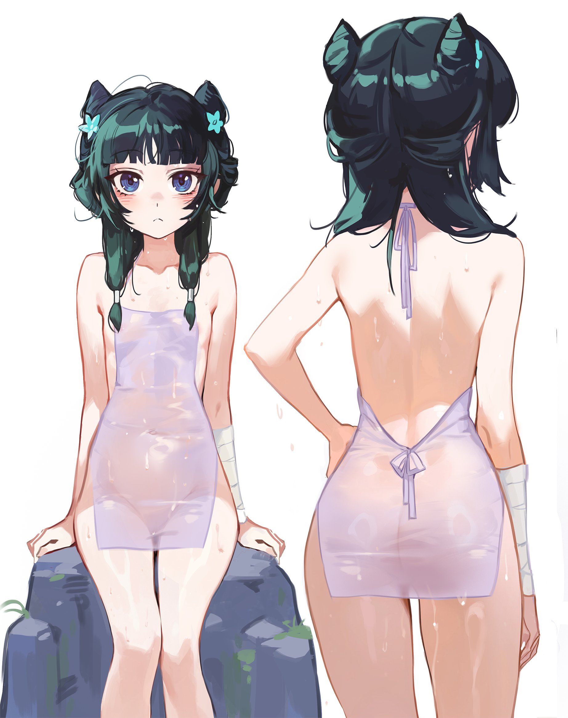 Tags: areola slipassbackbandaged armbandagesblue eyesbreastsclosed mouthcone hair buncovering privatescowboy shotdouble bunfeet out of framefemaleflat chestflowerfrom behindgreen hairhair bunhair flowerhair ornamenthair over shoulderhand on own hiplong hairlooking at viewerlow twintailsmultiple viewsnude coverpurple roberoberockRule34see-through clothessittingsmall breastsstandingtwintailswater dropwetwet clotheswhite background