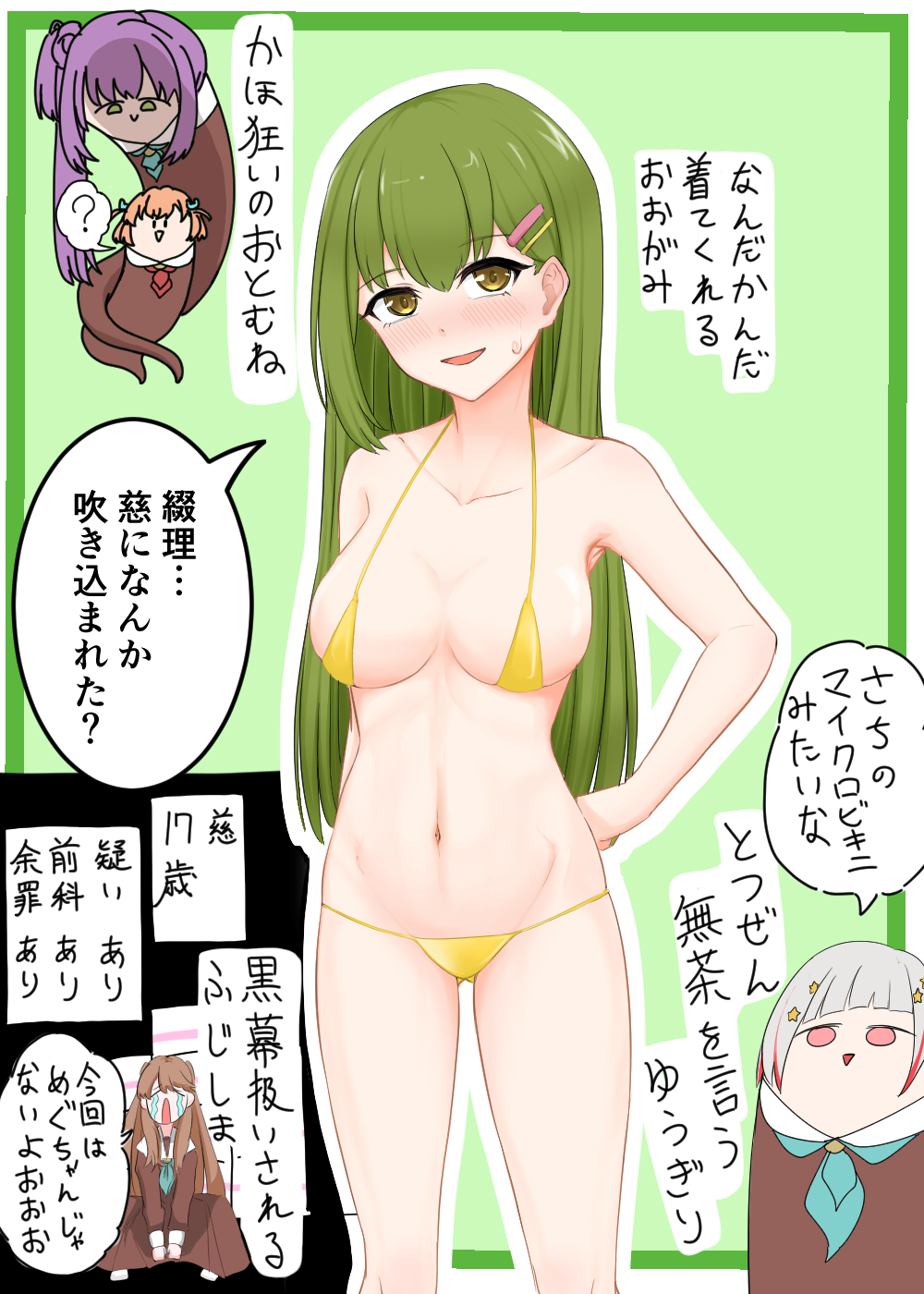 Tags: 1girls5girlsbikinibikini bottombikini topblushbreastsbrown haircollarbonecowboy shotfemalefemale focusgreen eyesgreen hairhairhaircliplong hairmedium breastsmicro bikininavelopen mouthorange hairparted lipspurple hairred eyesshort hairsmilesolo focussuper deformedsweatsweatdropswimsuittearsvery long hairwhite backgroundyellow bikiniyellow eyes