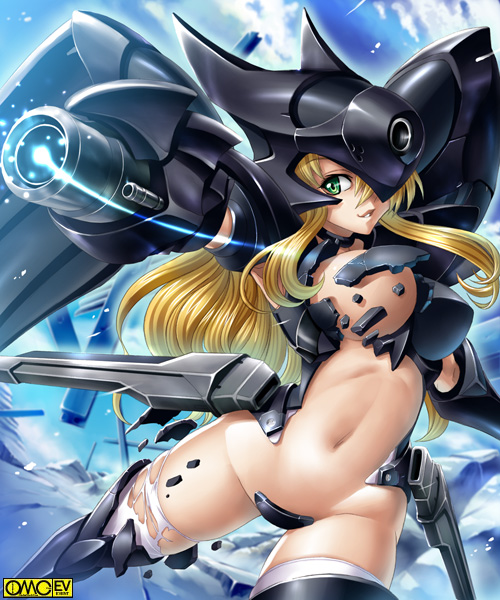 Tags: 1girlsarm cannonblonde hairbreastscurvydamagedfemalefemale onlygreen eyeslarge breastslight traillost clothesmecha musumemidriffpointy chinthighhighstorn clothesweapon