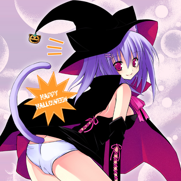 Tags: 1girlsanimal earsbreastscameltoecapecat earsclothingfemalefemale onlyhatlong hairlooking at viewerlooking backpantiespumpkinpurple hairpussysideboobtailunderwearwitchwitch hat