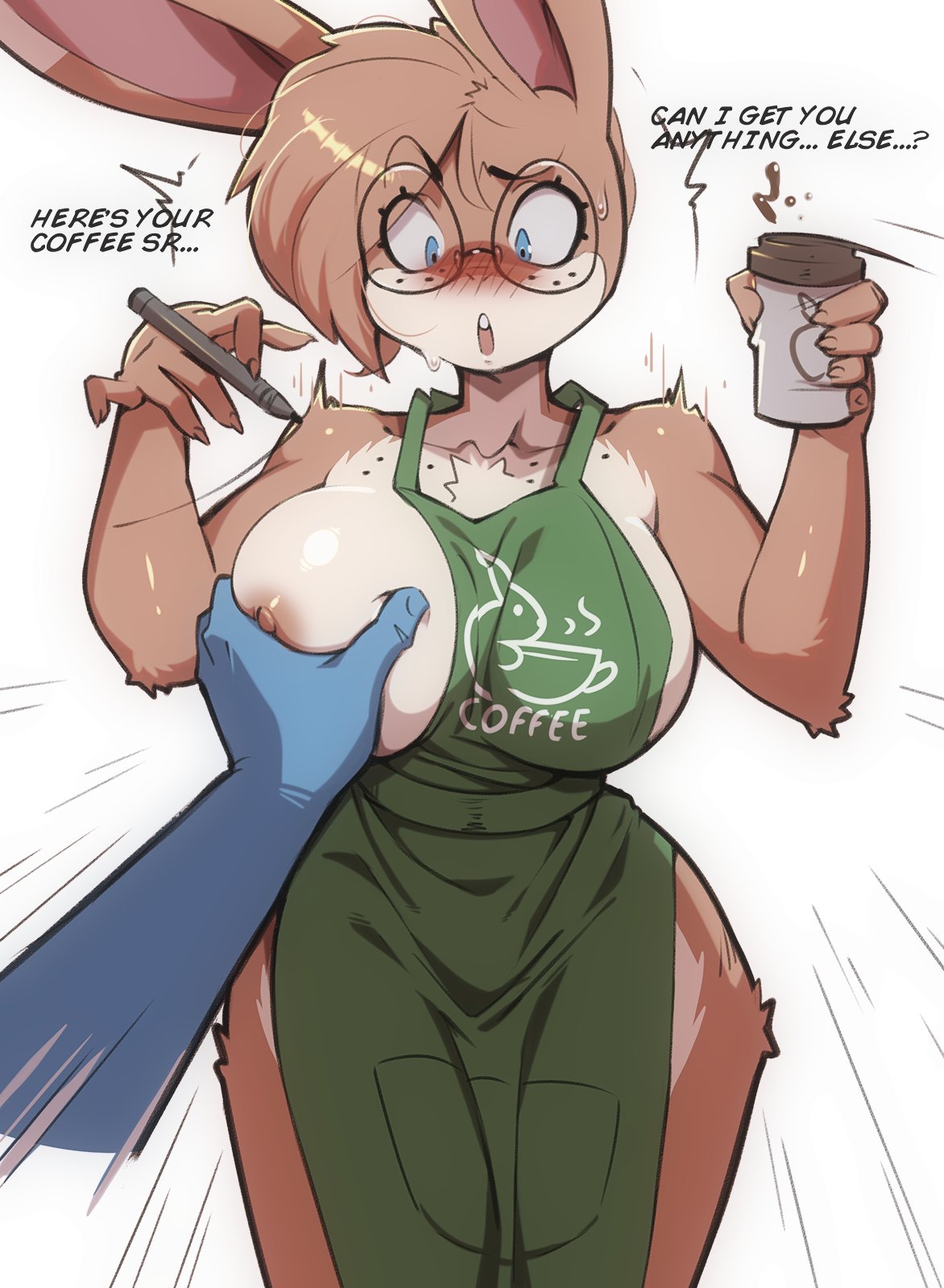 Tags: anthroapronapron onlyareolaarm tuftbig breastsblue eyesblushbreast grabbreastsbrown bodybrown furbrown hairchest tuftclothingcoffee cupcollarbonecontainercupdisembodied handelbow tufteyebrowseyelasheseyewearfemalefreckled breastsfreckled facefrecklesfurglassesglisteningglistening breastshairhand on breastlagomorphleporidmammalnipplesopen mouthpenrabbitsolotan bodytan furtuftwide hips