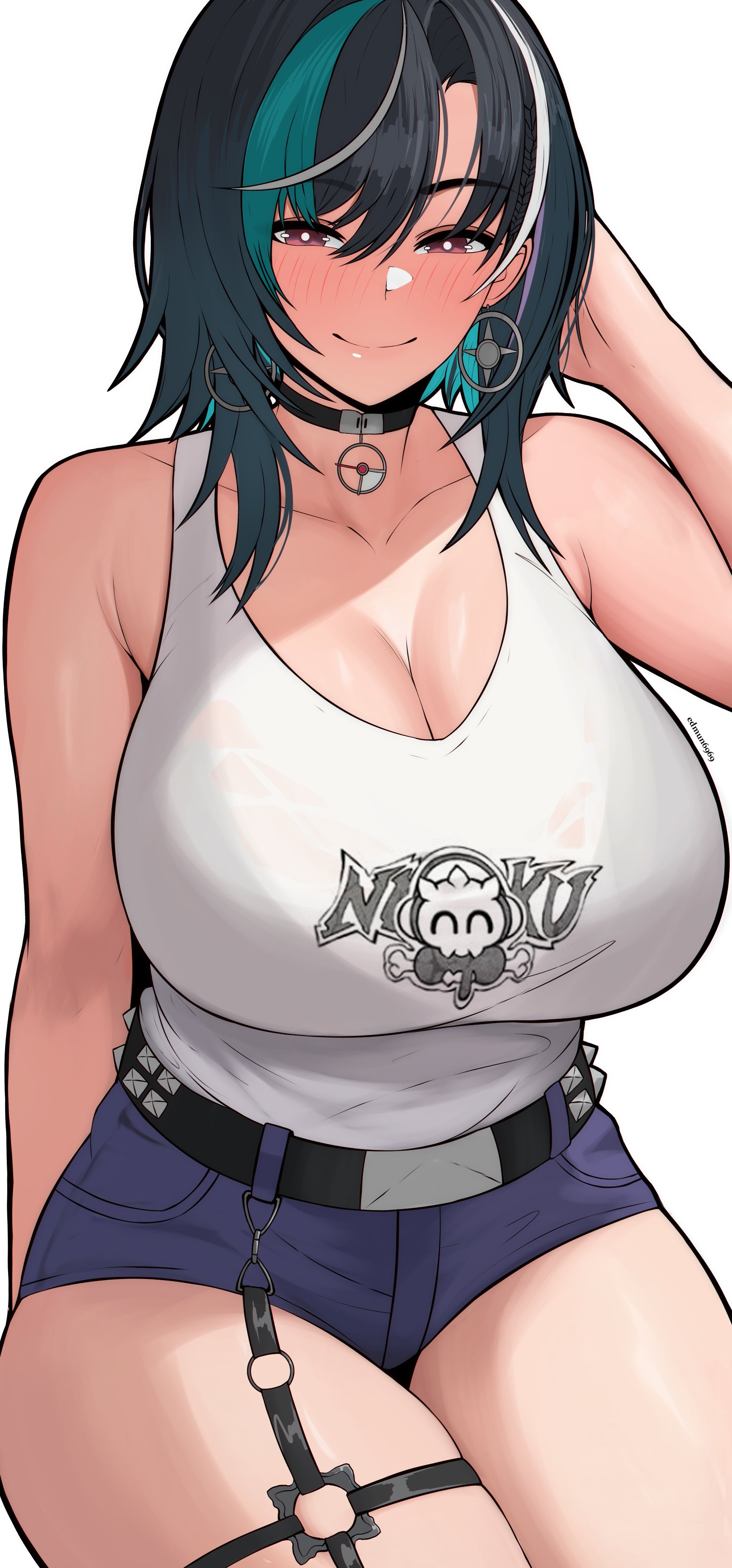Tags: 1girlsaqua hairbare shouldersbeltblack beltblack chokerblack collarblack hairblushblushing at viewerbreastsbustbustybusty femalebusty girlchokerclosed mouthclothedclothed femaleclothingcollarcollarbonecurvaceouscurvaceous bodycurvaceous femalecurvaceous figurecurvaceous hipscurvaceous thighscurvescurvycurvy bodycurvy femalecurvy figurecurvy hipscurvy thighsdenimdenim shortsearringearwearfemalefemale focusfemale onlyfully clothedhand behind headhipshuge breastshuge thighshumanhuman onlylarge breastslarge thighslipslooking at viewermedium hairmouth closedmulticolored hairo-ring chokero-ring thigh strapone hand behind headpendant chokerprint clothesprint clothingprint tank toppurple hairpurple streakred eyesseductiveseductive bodyseductive eyesseductive gazeseductive lookseductive mouthseductive smileshort shortsshoulderssittingsmilesmilingsmiling at viewersolosolo femalesolo focusstreaked hairtank topthick thighsthigh strapthighsthunder thighswhite hairwhite shirtwhite streakwhite tank topwide hips