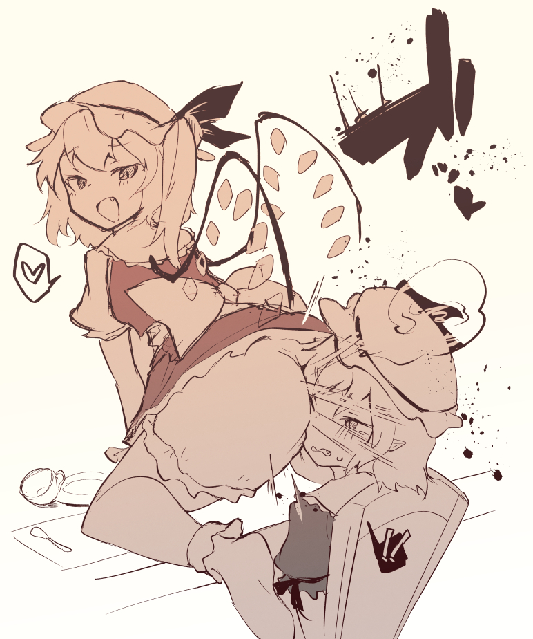 Tags: 2girlsassbat wingsbloomersblushbowtiechairclothedclothingdisgustedexclamation pointface in assfartfart fetishfemaleflandre scarlethatimageboardjapanese textmonochromenekosuon kneesonomatopoeiaopen mouthremilia scarletRule34texttouhouunderwearwings