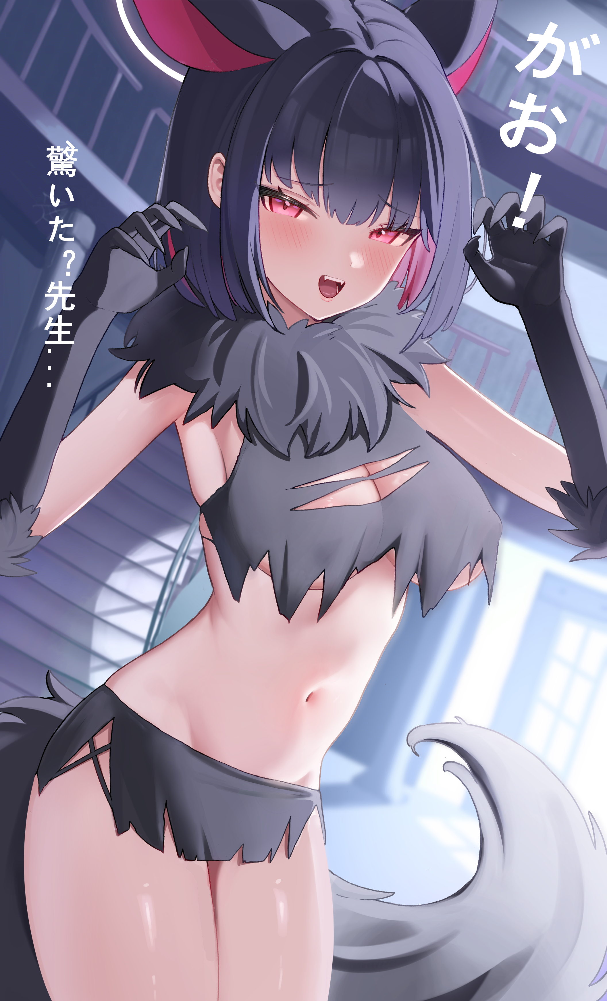 Tags: 1girlsanimal earsbig breastsblack hairblushbreastscleavagecrop topfemalefemale onlygloveslight skinlight-skinned femalelong glovesminiskirtmulticolored hairnavelnipple bulgeopen mouthpink eyespink hairripped clothingskirtstandingstomachtailthighstongueunderboob