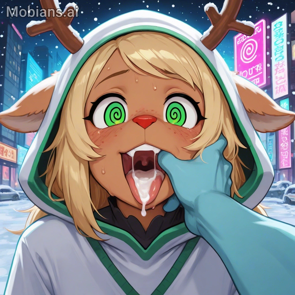Tags: 1boyafter fellatioafter oralantlersblonde hairblue skinbrown furcitycum in mouthfemalefrecklesfurryfurry femalehand on facehappy tranceheadshot portraithoodhoodedhuman malehypnosislong hairlooking at viewermalemind controlneon signoutdoorspovpov handsred nosereindeerrobesmilingsnowsnowingspiral eyesstraightthumb in mouthtonguetongue outwhite robe