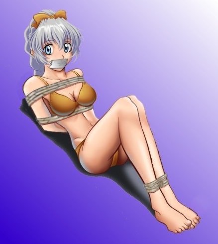 Tags: 1girlsarms behind backbikiniblue eyesbondageboundbound anklesbound armsbreastsfemalefemale onlygaggaggedsoloswimsuittapetape gagtaped mouthtied upwhite tape
