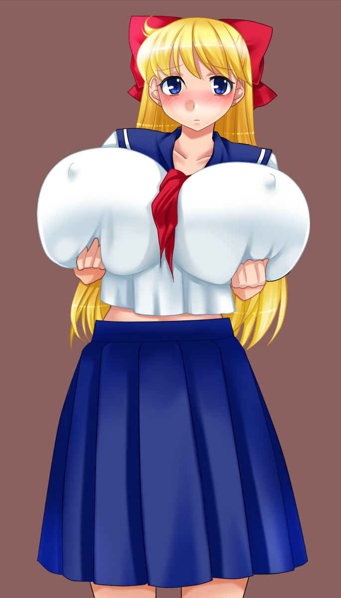 Tags: 1girlsbig breastsblonde hairblue eyesblushbowbreast grabbreast liftbreastsclothingerect nippleserect nipples under clothesfemalefemale onlygigantic breastshuge breastshumanlarge breastsnipplesschool uniformschoolgirlskirtsolostraight hair
