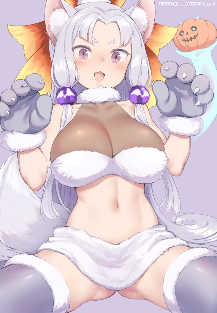 Tags: :3animal ear fluffanimal earsanimal handsblushbreastscleavagefemalefur collarfur trimfur-trimmed legwearghostglovesgrey hairgrey thighhighshair ornamenthalloween costumejack-o'-lanternlarge breastslong hairopen mouthpaw glovespaw posepurple backgroundpurple eyessidelockssleevelesstailthighhighsvery long hair