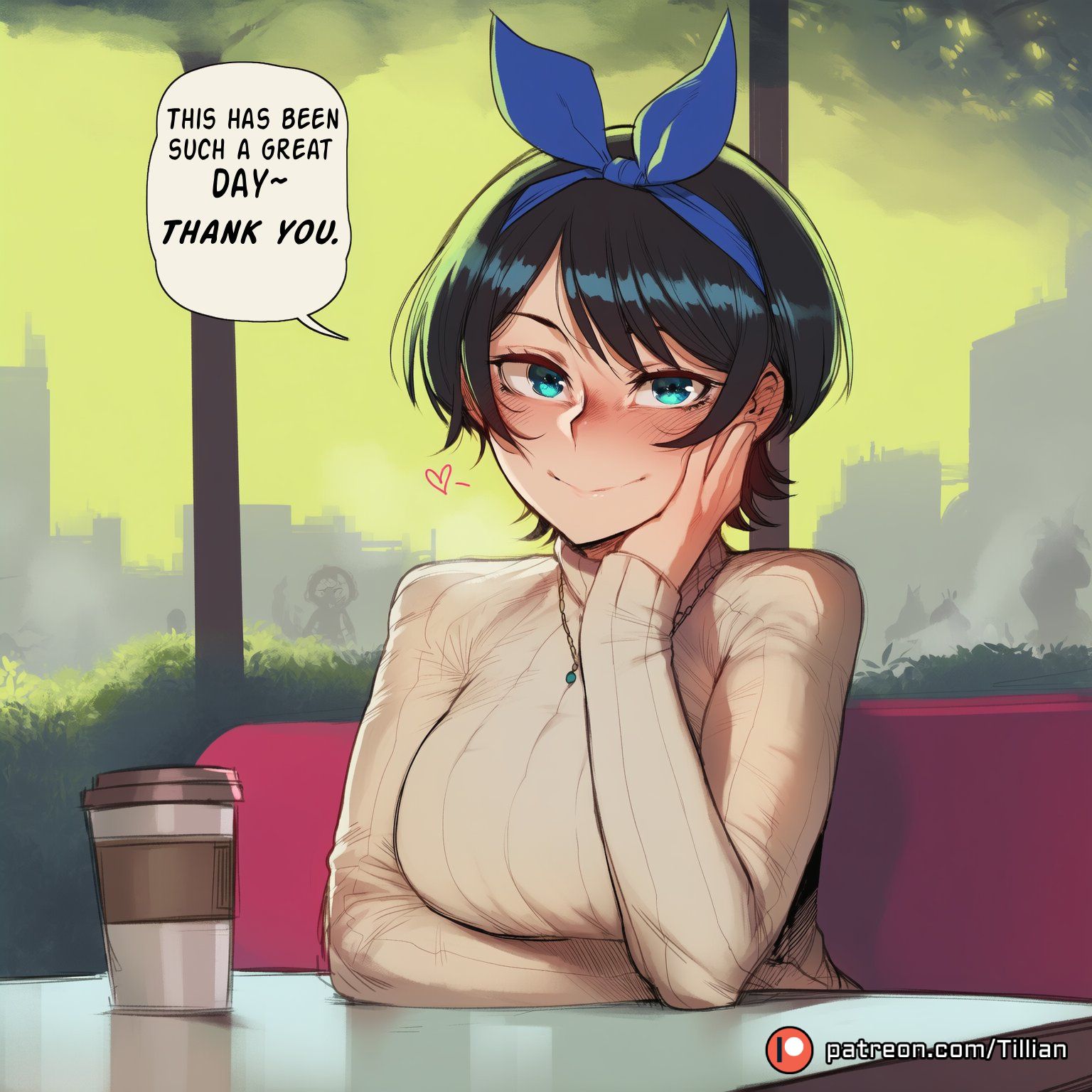 Tags: black hairblue eyesblue hairbandblue ribbonblushbreastscafeclosed mouthcoffee cupcupdisposable cupfemalehair ribbonhairbandhand on own cheekhand on own faceheartindoorsjewelrylarge breastslong sleeveslooking at viewernecklacepeoplepovpov across tablerestaurantribbed sweaterribbonshort hairsittingsmilesolosolo focussweatertableturtleneckturtleneck sweaterupper bodywhite sweater