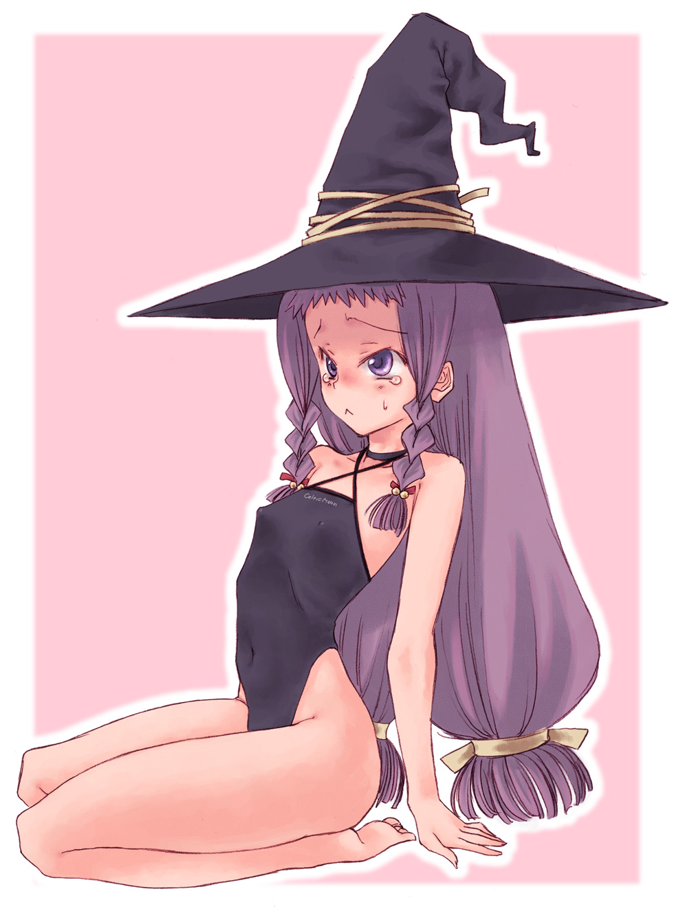 Tags: blushfemaleflat chesthatnipplesone-piece swimsuitpurple eyespurple hairribbonribsRule34swimsuittearswitch hat