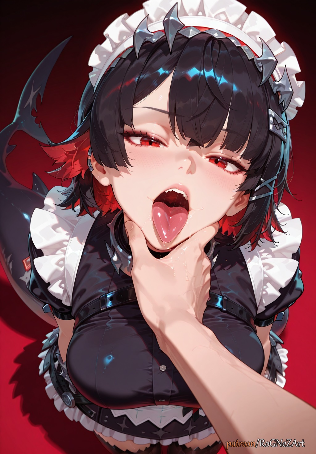 Tags: 1boyanimal tailbangsblack hairblushbreastscleavagedresseye contactfemalefemale focusflushedhair accessoryhair ornamenthand on another's chinhuge breastslarge breastslooking at viewermaidmaid headdressmalemoaningmulticolored hairopen mouthpiercingpovred eyesred hairsalivashort hairshort sleevessolosolo focustailteeththighhighstonguetongue outtwo tone hairuvula