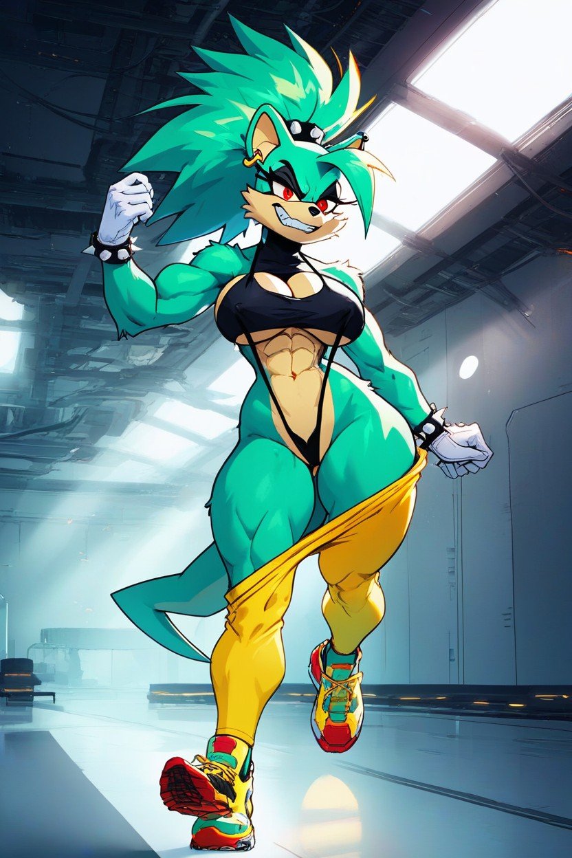 Tags: aggressive smilebig assbig breastblack and yellow punk shoesblack makeupblack sleeveless t-shirtclenched teethear piercingexcessive smokeexcessive sweatingfitness bodyhedgehog specieslime furlime spiked ponytail hairmobianred eyesspikes brazaletethick thighsvanilla skinwhite glovesyellow gym pants
