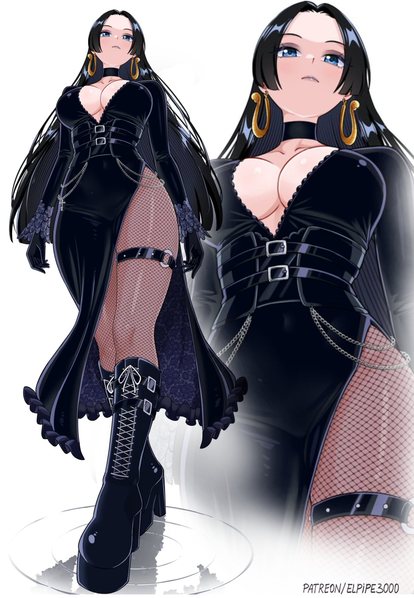 Tags: 1girlsalternate costumeblack bootsblack chokerblack dressblack hairblue eyesbootsbreastschokerdressearringselpipe 3000femalefishnet pantyhosefishnetsjewelrylarge breastso-ringo-ring thigh strappantyhosesnake earringssolothigh strapwhite background