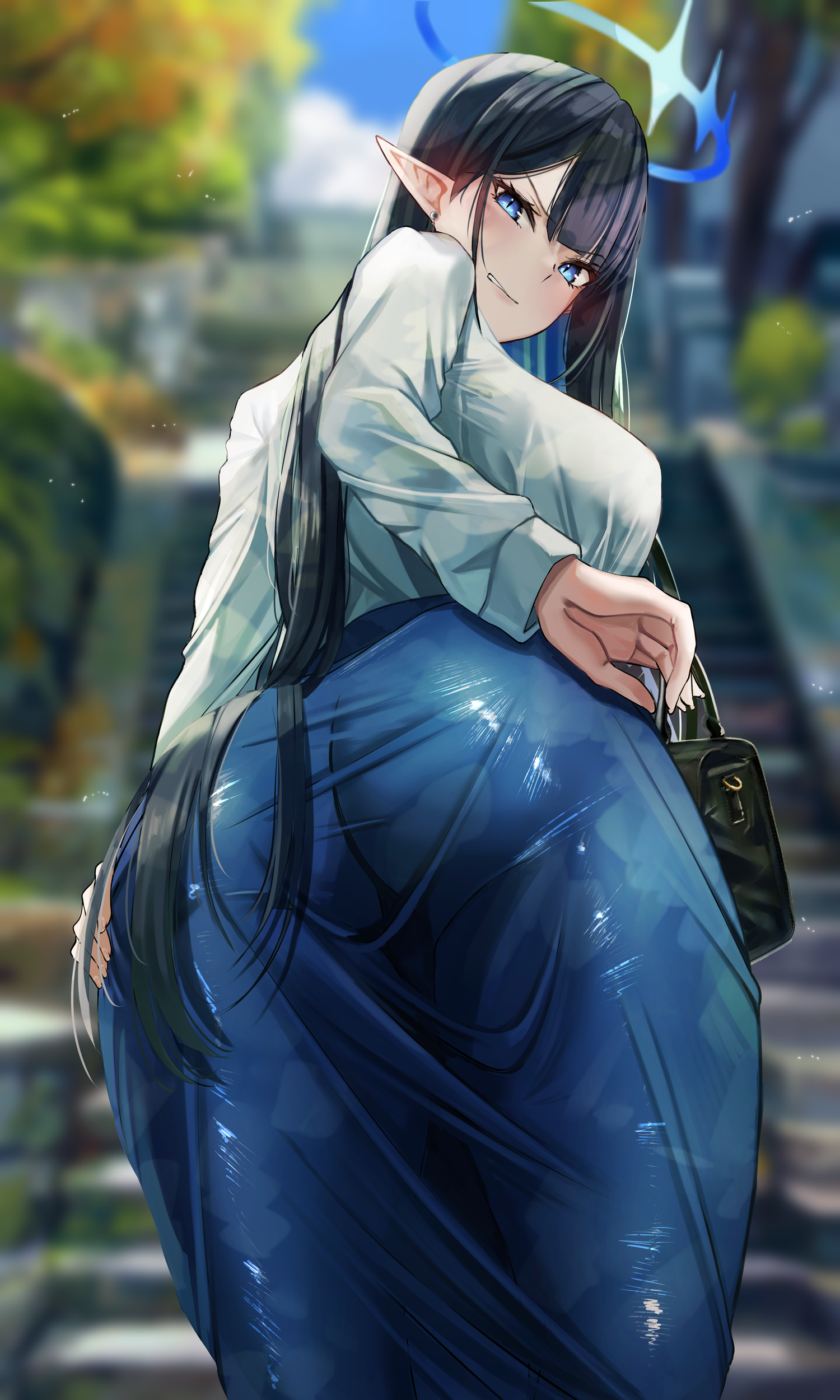 Tags: 1girlsalternate costumeassblack bagblack hairblue eyesblue haloblue skirtblushbreastsdayfemalefrom behindhalolarge breastslong hairlong sleeveslooking at viewerlooking backoutdoorsparted lipspointy earsshirtskirtwetwet clotheswhite shirt