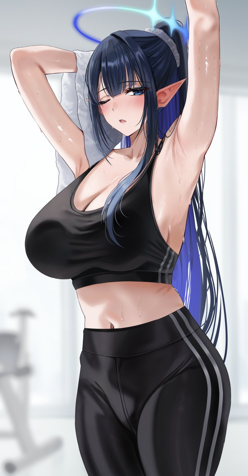Tags: 1girlsarmpitsarms upblack hairblack sports brablue eyesblue hairblue haloblunt bangsblushbreastscleavagecolored inner hairfemalehair ornamenthair scrunchiehalohigh ponytailhigh-waist pantsholdingholding towellarge breastslong hairmulticolored hairnavelone eye closedopen mouthpantspointy earsponytailscrunchiesidelockssolosports brastandingsweattowelvery long hairyoga pants