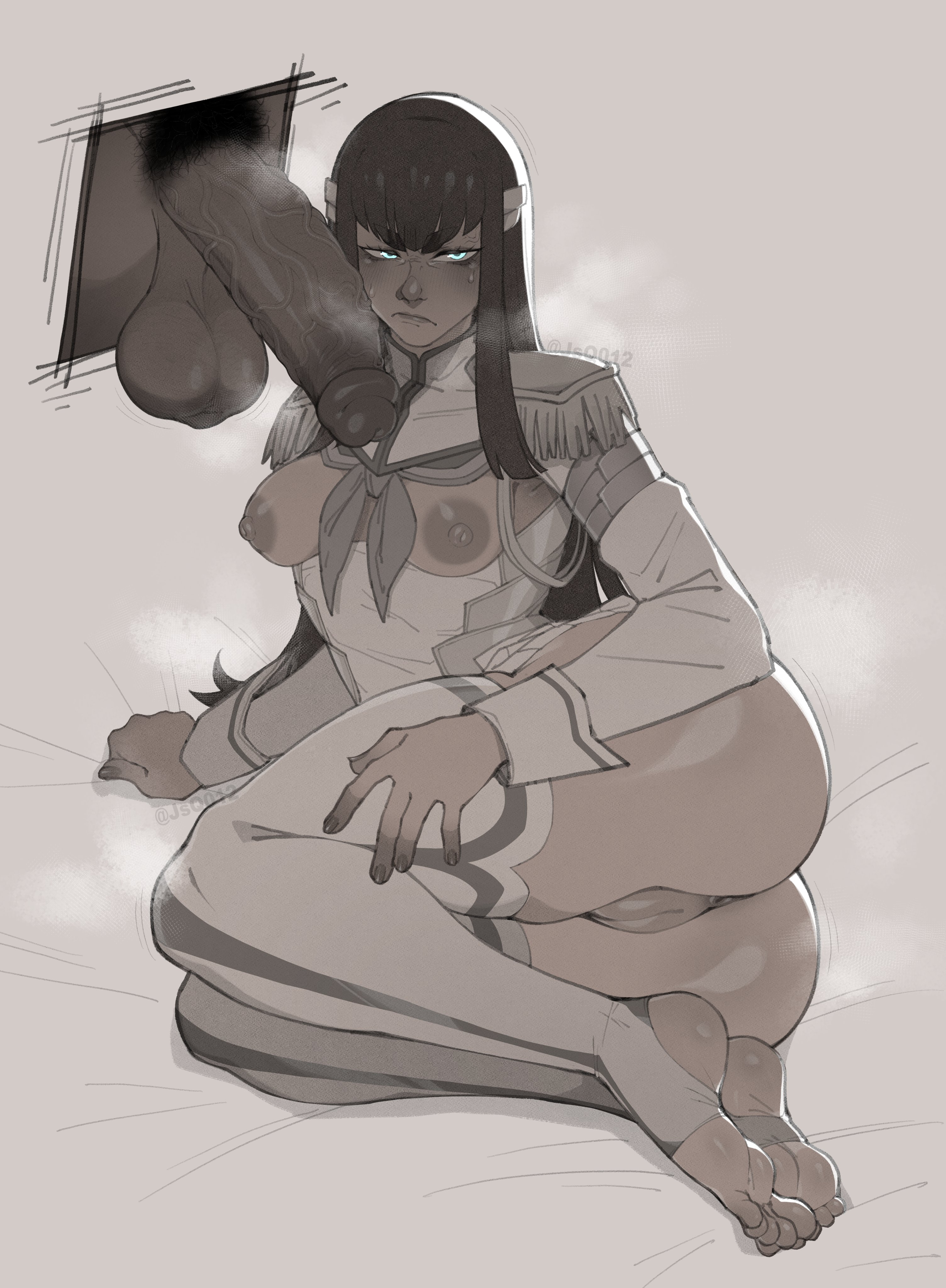 Tags: 1boy1girlsannoyedannoyed expressionblack hairbreastsbreasts outfeetfemalefemale focusmedium breastspenispubespubic hairpussythighs
