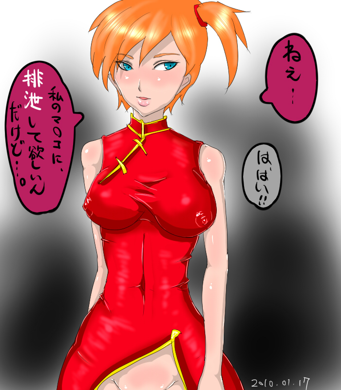 Tags: blue eyesblushbottomlessbreastschina dresschinese clothesfemalefemale onlyhumanhuman onlylarge breastsnipplesorange hairside ponytailsolostraight hair