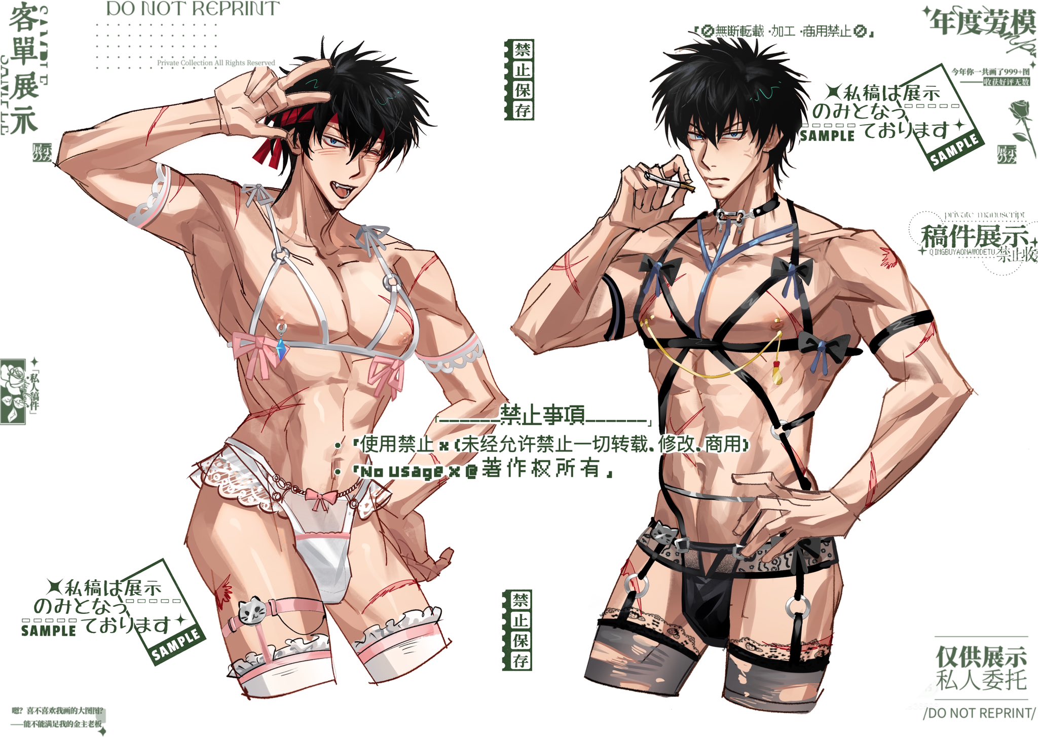 Tags: 2boysangryannoyedblack hairblushbulgecigaretteclonecrossdressingdual personagartergarter beltgarter strapsheadbandlace-trimmed thighhighslingerielinked nipplesmalemale onlymuscularmuscular femalenipple piercingnipple ringscarsscars all oversmokingthigh strapthighhighsv signwink