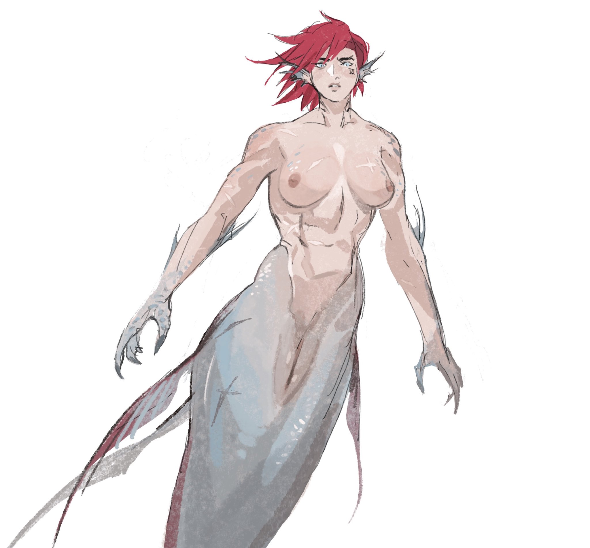 Tags: alternate formfacial tattoofemalefinsgrey eyeshead finsmermaidmonster girlmonsterificationparted lipspink lipspussyred hairscalesscarscar on breastsscar on chestshort hairsolostomachtattooundercutwhite background