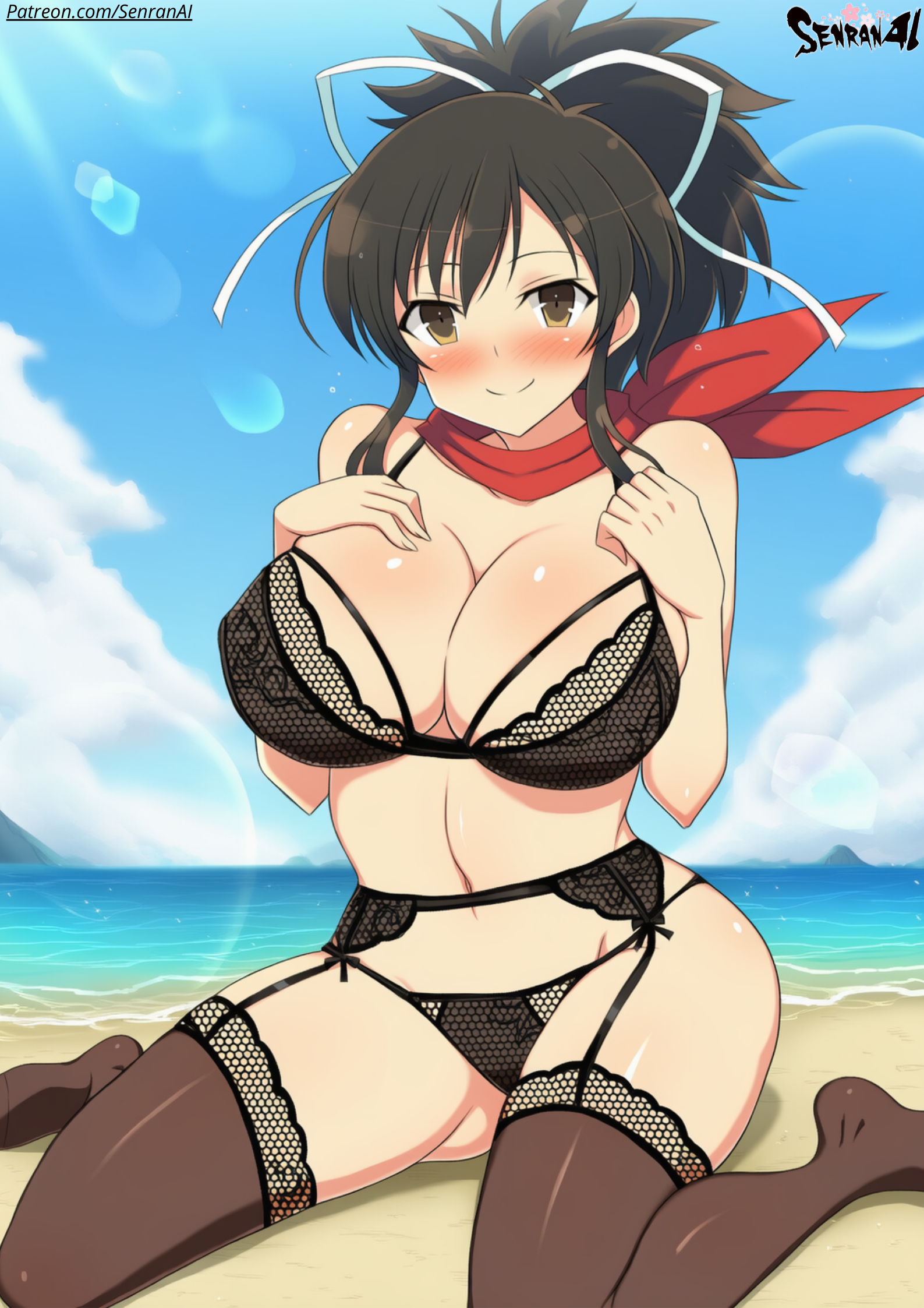 Tags: 1girlsbeachblack lingerieblushbreastsbrown haircurvy figurelarge breastslingerielooking at viewerponytailred scarfribbonsenranaishort hairshort ponytailsmilesolosolo femalevoluptuous femalewhite ribbon