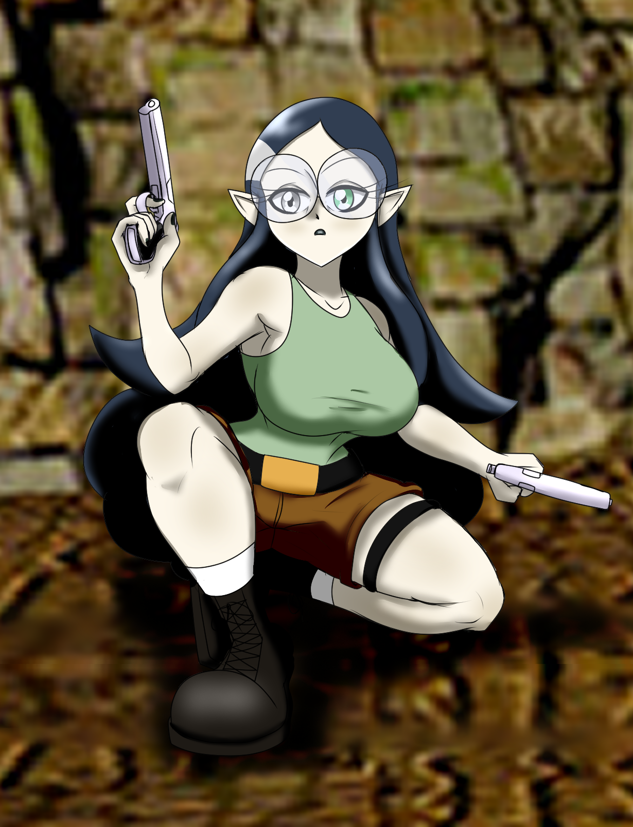 Tags: big breastsblue hairbootsbrown shortscosplaydual wieldingglassesgreen tank topgrey streakgunsheterochromialarge breastspointy earsshort shortssquattingthick thighsthigh strap