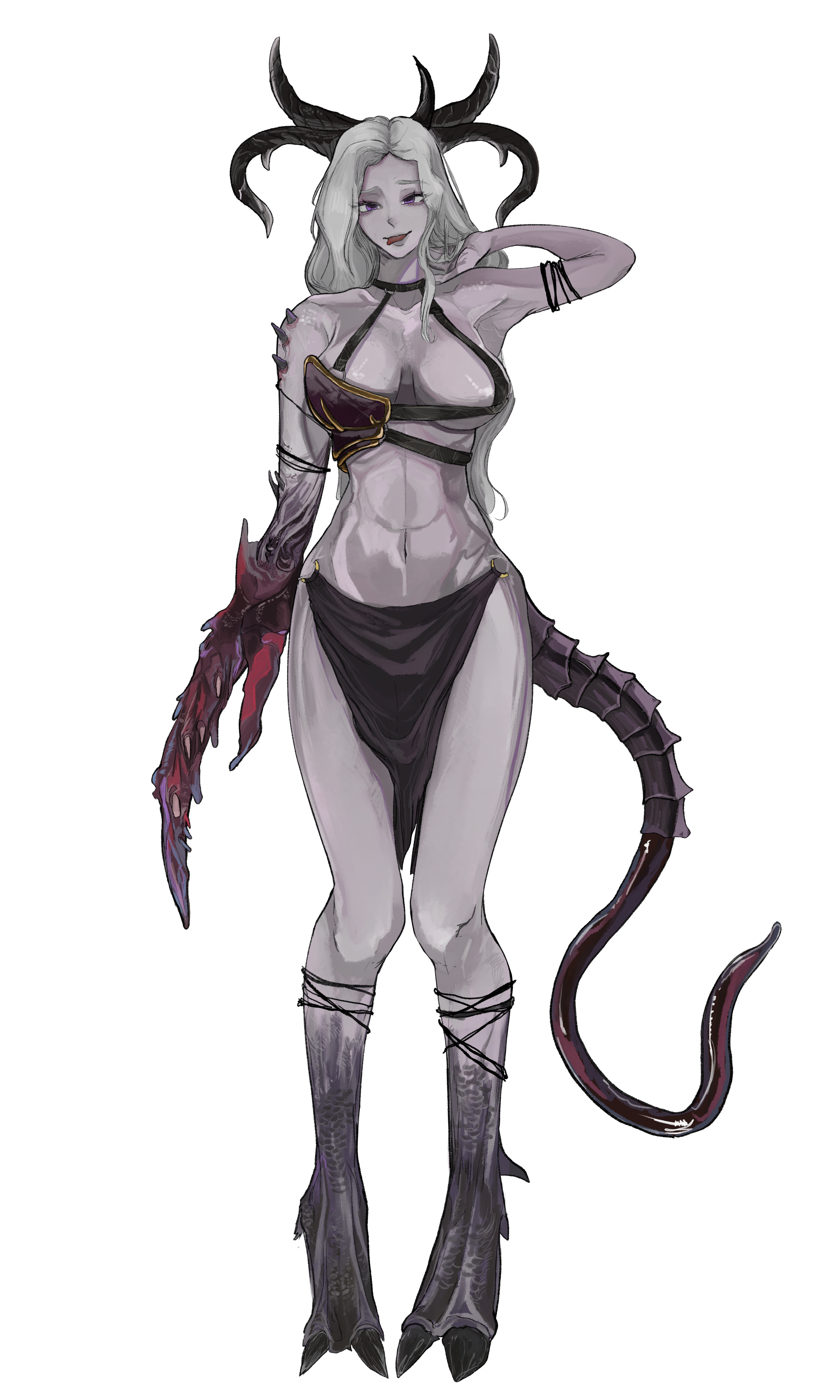 Tags: 1girlsarmorbelly buttonbig breastsbrabreastsclawshornslong hairpurple eyespurple skinskirttailteasingteasing viewertonguetongue outwhite hair