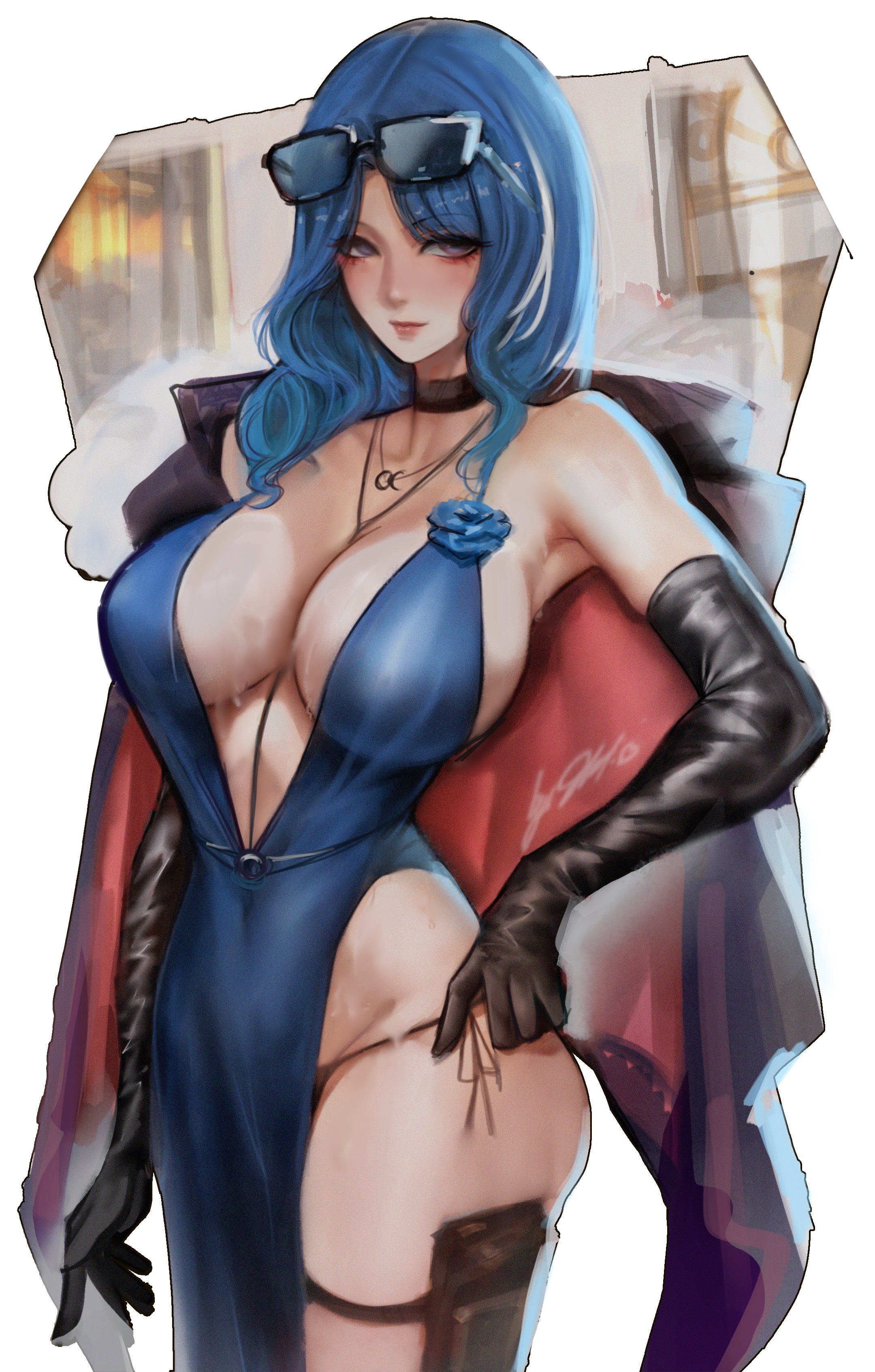 Tags: bare shouldersblack chokerblack glovesblue dressblue hairbreastschokercleavageclosed mouthcoatcoat on shouldersdresselbow glovesevening gowneyewear on headfemaleglovesgrey eyesholsterjewelrylarge breastslong hairlooking at viewermulticolored hairnecklacepantylinessherylnomesleevelesssleeveless dresssolostreaked hairthigh holsterthigh strapwhite background