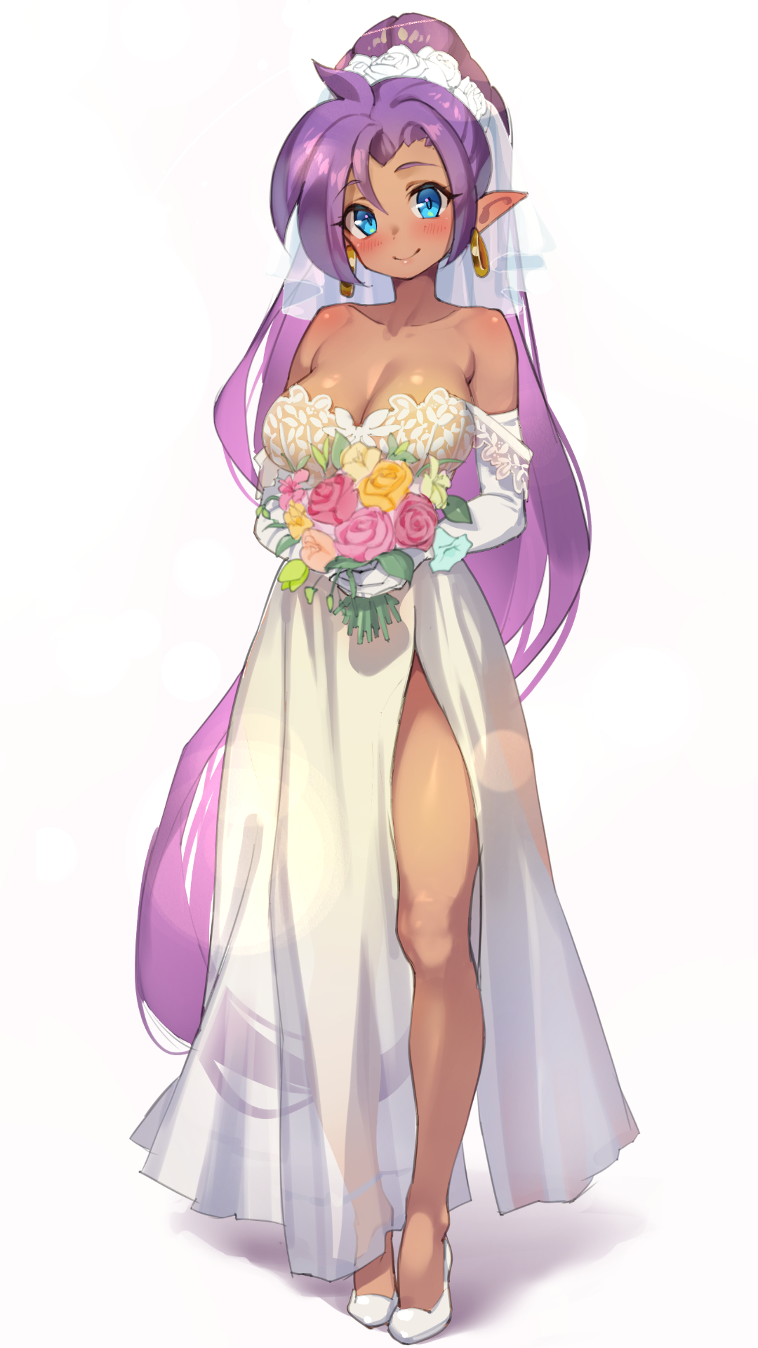 Tags: alternate costumebare shouldersblue eyesbouquetbreastsbridal veilcleavagedark skindark-skinned femaledressearringsfemalefull bodyjewelrylarge breastslong hairlooking at vieweroff shoulderoff-shoulder dresspointy earsponytailpurple hairshantae (series)side slitsmilesolostandingveilvery long hairwedding dresswhite background