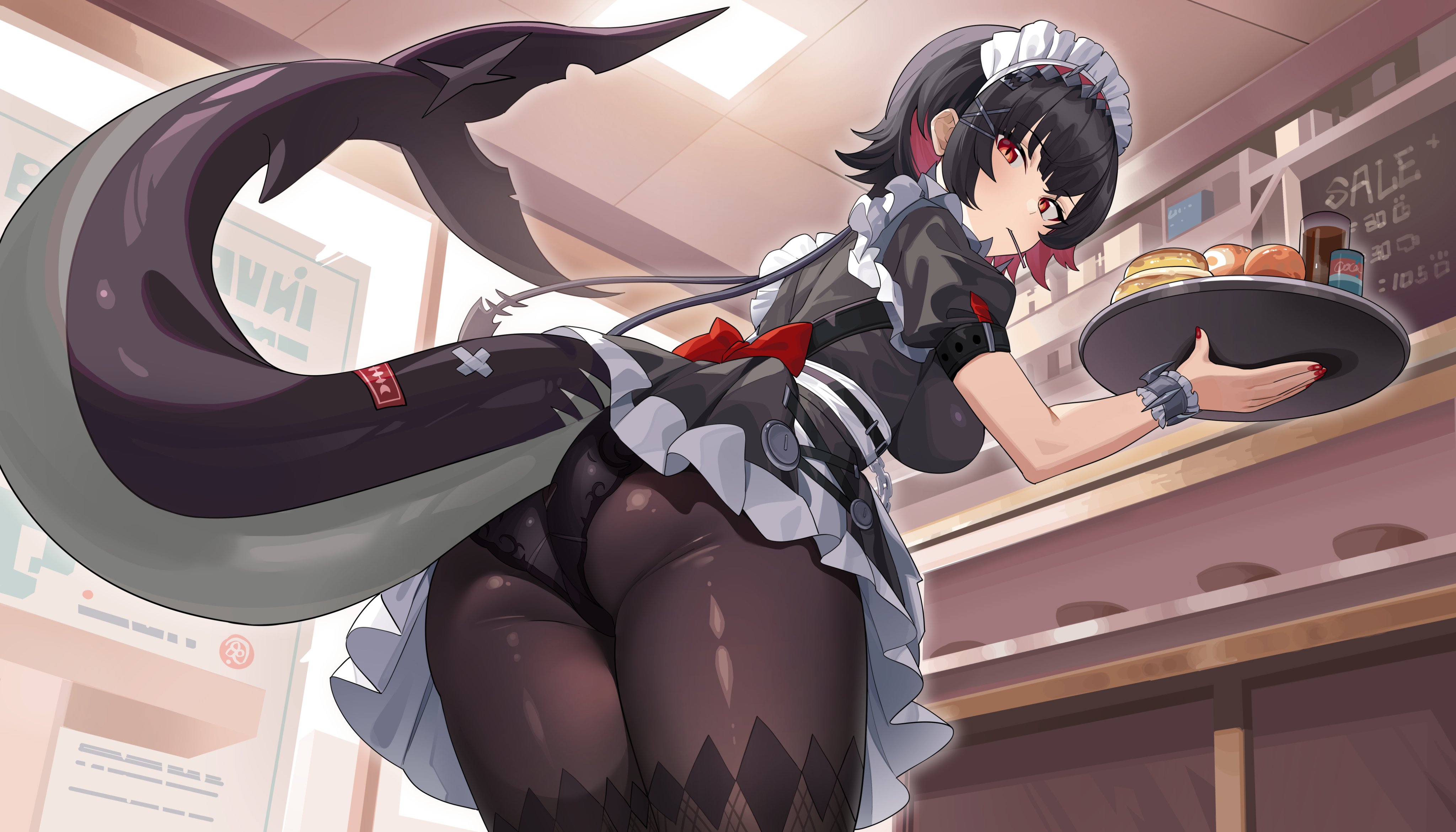 Tags: 1girlsassblack dressblack hairbreastscolored inner haircounterdressfemalefinsfish tailfrom behindhair ornamenthairbandholdingholding trayindoorslarge breastsleaning forwardlollipop in mouthlooking at viewerlooking backmaidmaid headdressmetal hairbandmolemole under eyemulticolored hairpantiespanties under pantyhosepantyhosered eyesred nailsscarscar on tailshark girlshark tailshort hairsolospiked headbandtailtraytwo tone hairunderwearx hair ornament