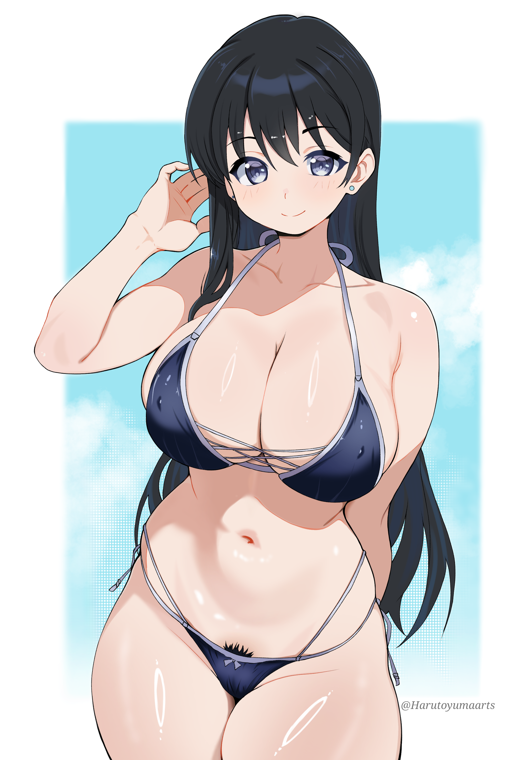 Tags: 1girlsbare armsbikiniblack hairblue bikiniblue skyblushbreastscleavagecollarbonecovered erect nipplescurvyearringsfemalefemale focusfemale onlyfemale pubic hairhair between eyeshuge breastsjewelrylarge breastslong hairlooking at viewernavelnipple bulgepubic hairpubic hair peekpurple eyesskysmilesolosolo femalesolo focusstandingstud earringsswimsuitthighsvery long hairwhite background