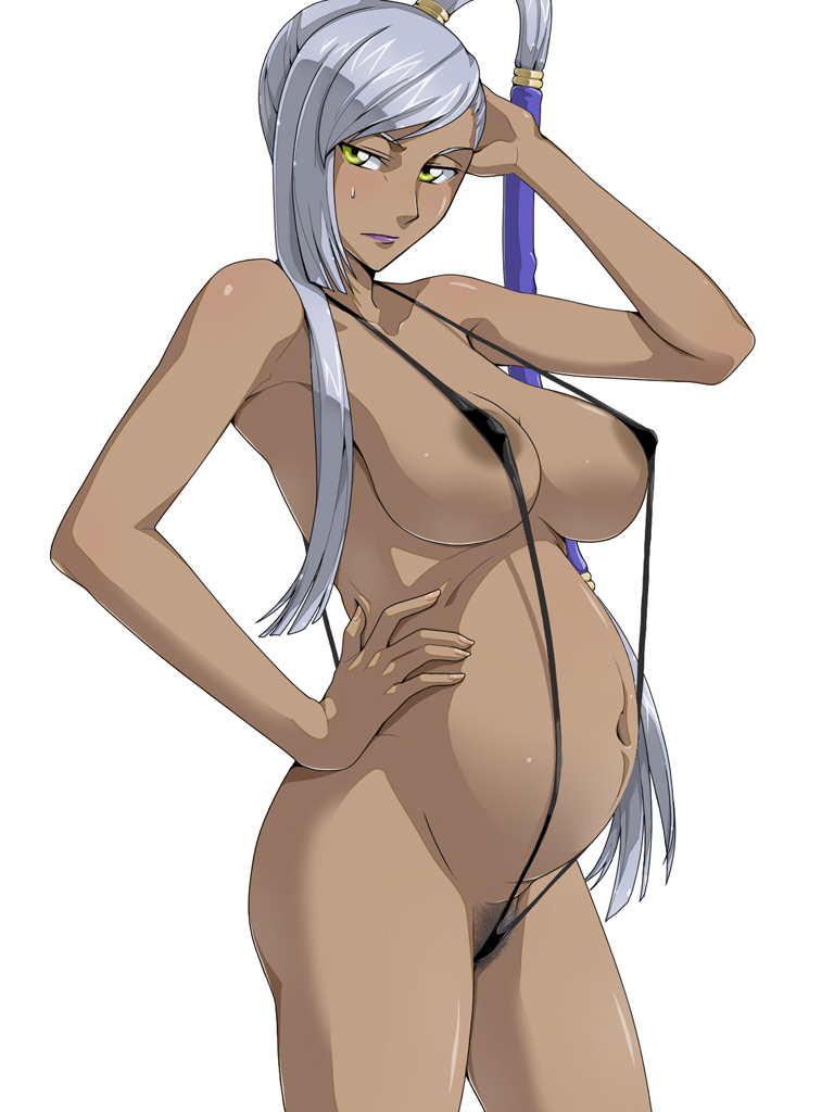 Tags: 1girlsbreastsdark skinfemalehand on hiphipslarge breastslong hairpregnantpubic hairsilver hairsling bikinisolostandingswimsuityellow eyes