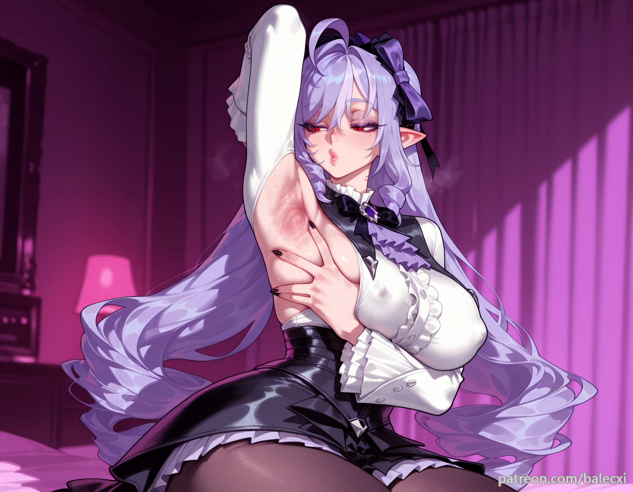 Tags: ahogearm uparmpitsblack skirtbowcovered nipplesfemalefrillsindoorslarge breastslong hairlong sleevespantyhosepointy earspresenting armpitpurple hairred eyessittingsolowhite shirt