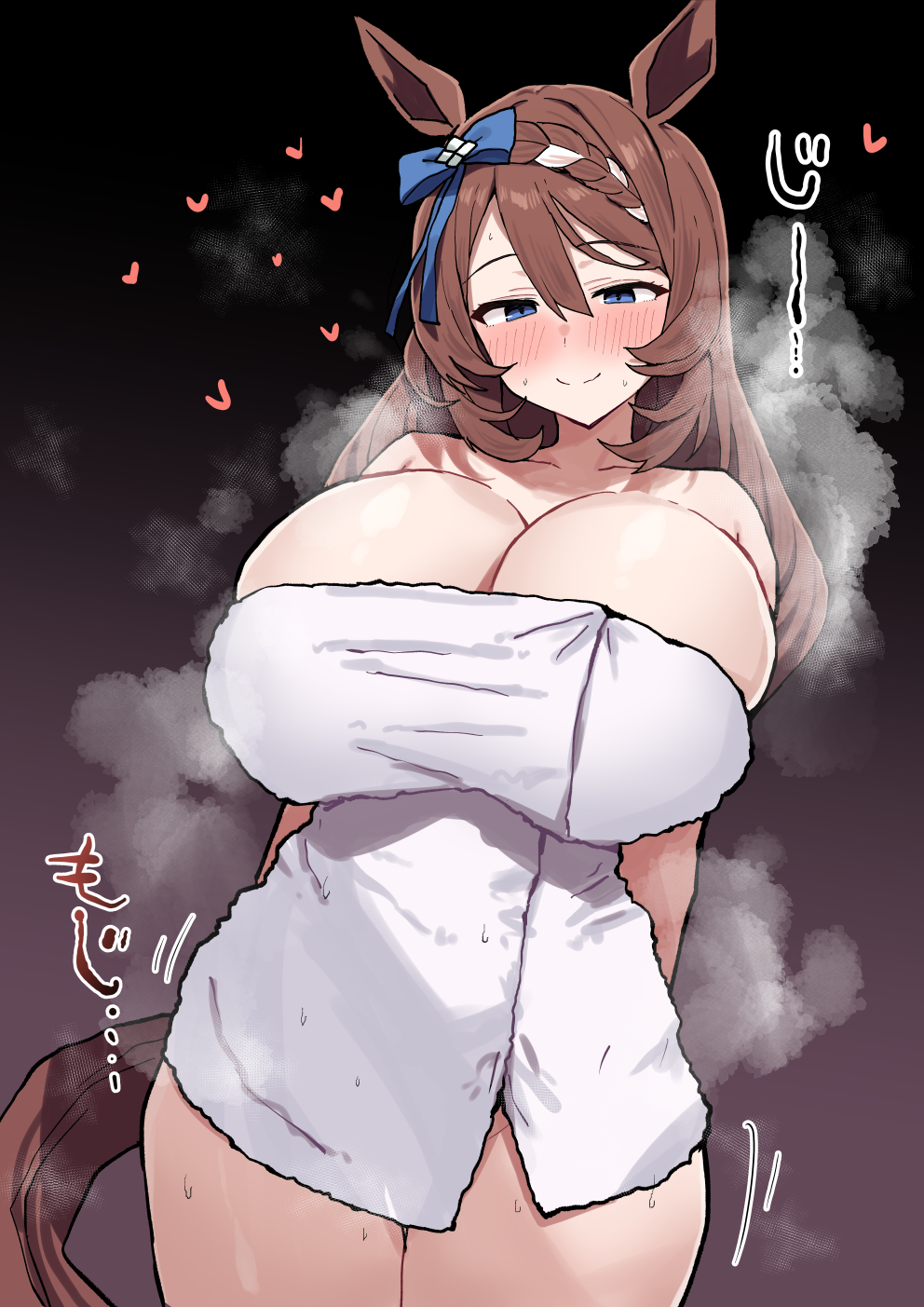 Tags: animal earsblack backgroundblue bowblue eyesblushbowbraidbreastscleavageclosed mouthear bowfemalehair between eyeshorse earshorse girlhorse tailhuge breastslooking at viewermulticolored hairnaked towelsmilesolostreaked hairsweattailthighstowelwhite hair