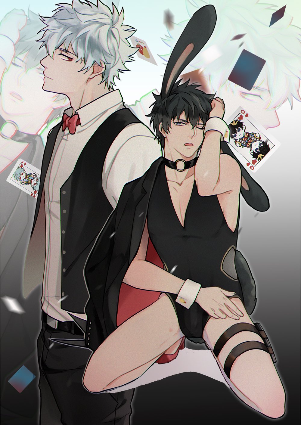 Tags: 2boysalternate costumeblack hairbunny earsbunny tailbunnysuitcasinochokercrossdressinghickeyhickey marksjacket on shouldersleotardmalemale onlymale playboy bunnyone eye closedplaying cardsquattingthigh strap
