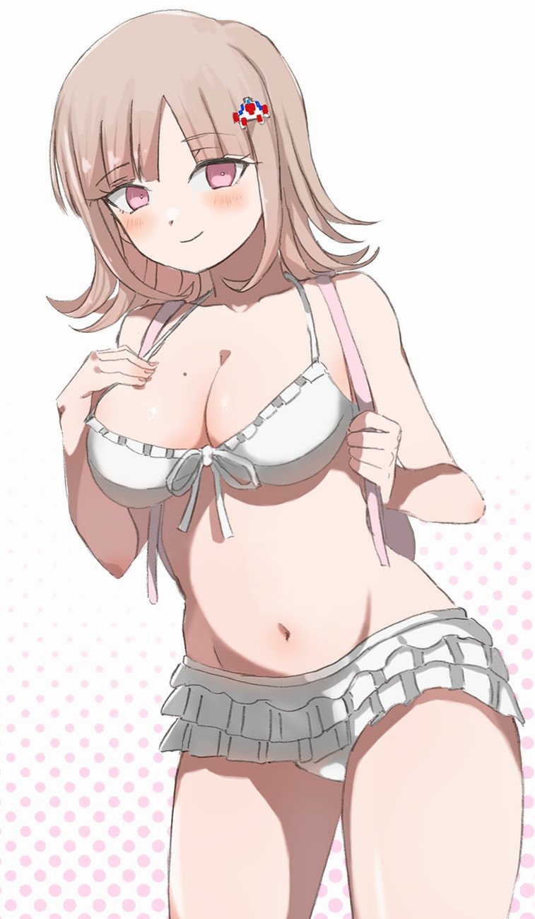 Tags: bare shouldersbikinibikini skirtbreastscleavagefemaleflipped hairlarge breastslooking at viewermedium hairmolemole on breastnavelsmilesoloswimsuitwhite backgroundwhite bikini