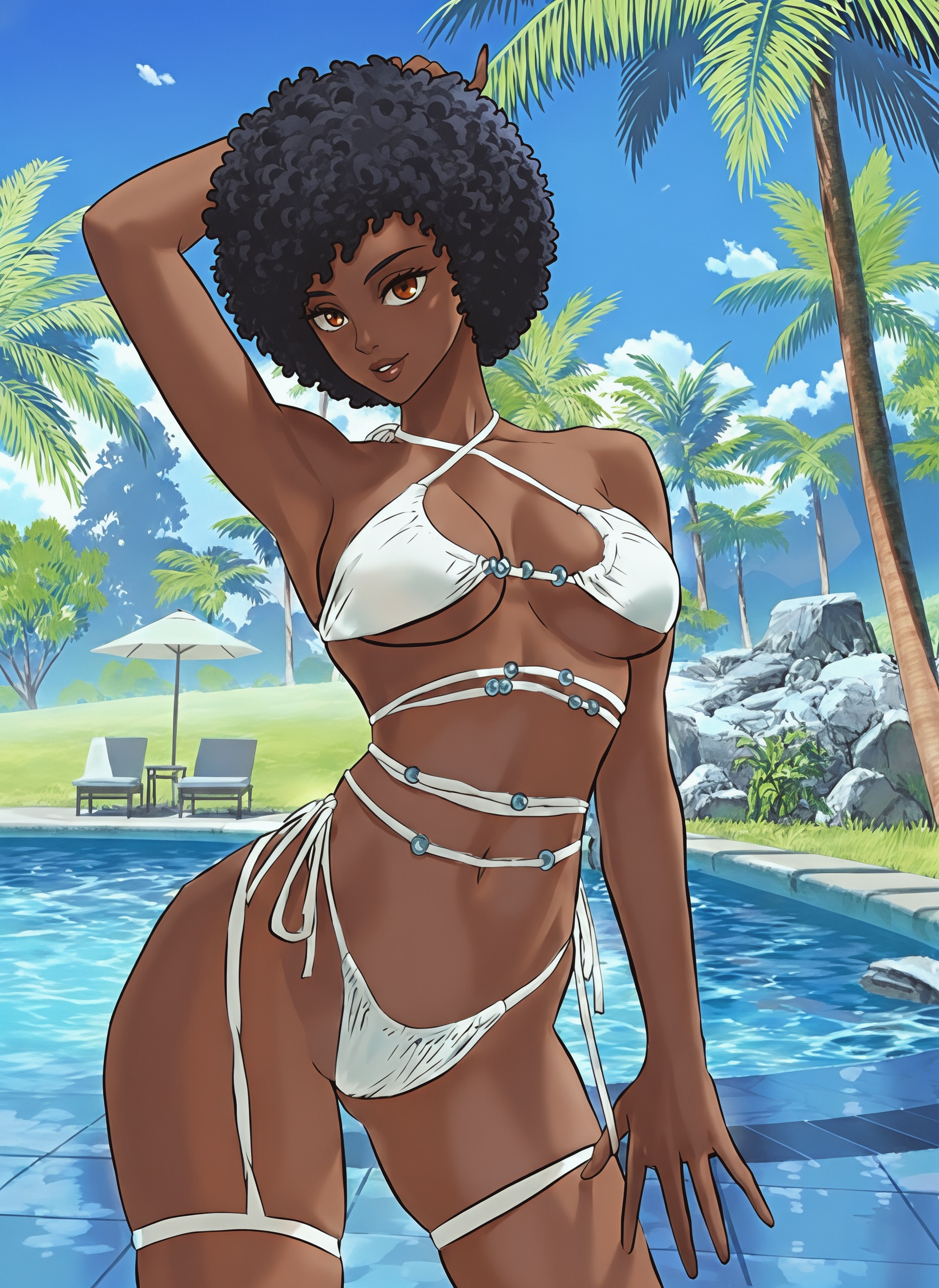 Tags: 1girlsafrican femaleafroarm upbikiniblack hairbrown eyesdark skindark-skinned femalehand on headoutdoorsoutsidepoolpoolsidesolosolo femaleswimsuitthick lipswhite bikini