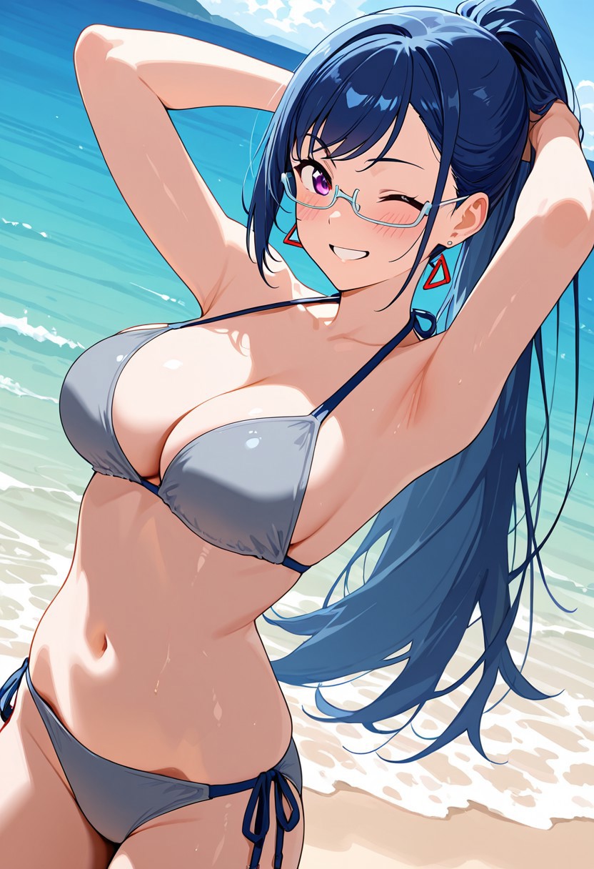 Tags: armpitsarms upbeachbikiniblue hairbreastsdynamic anglefemaleglassesgrey bikinilarge breastslong hairlooking at vieweroceanponytailpurple eyesred lipsticksmilewink