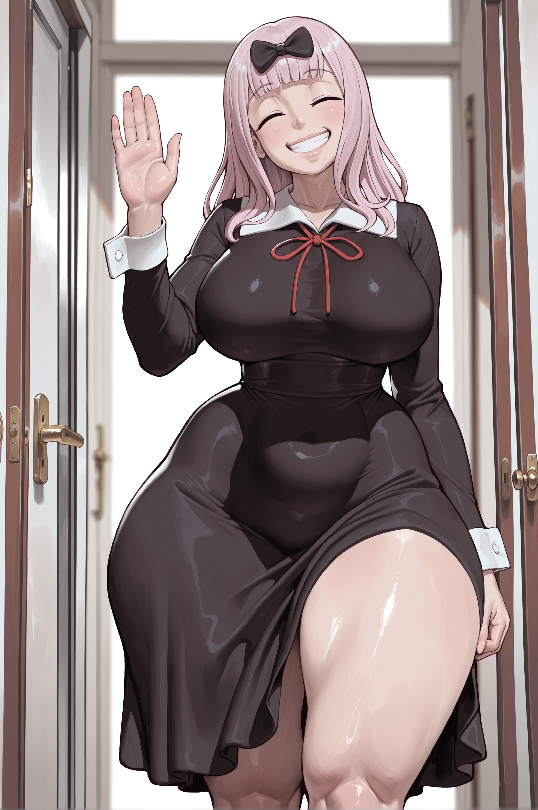 Tags: big breastsblack dressbreastscheerful expressionclosed eyescollared dressfemalefriendlyhairbowhand uphead tiltlipslong hairlong sleevesneck ribbonpink hairshuuchiin academy uniformsmilesmiling at viewerteeththick thighswide hips
