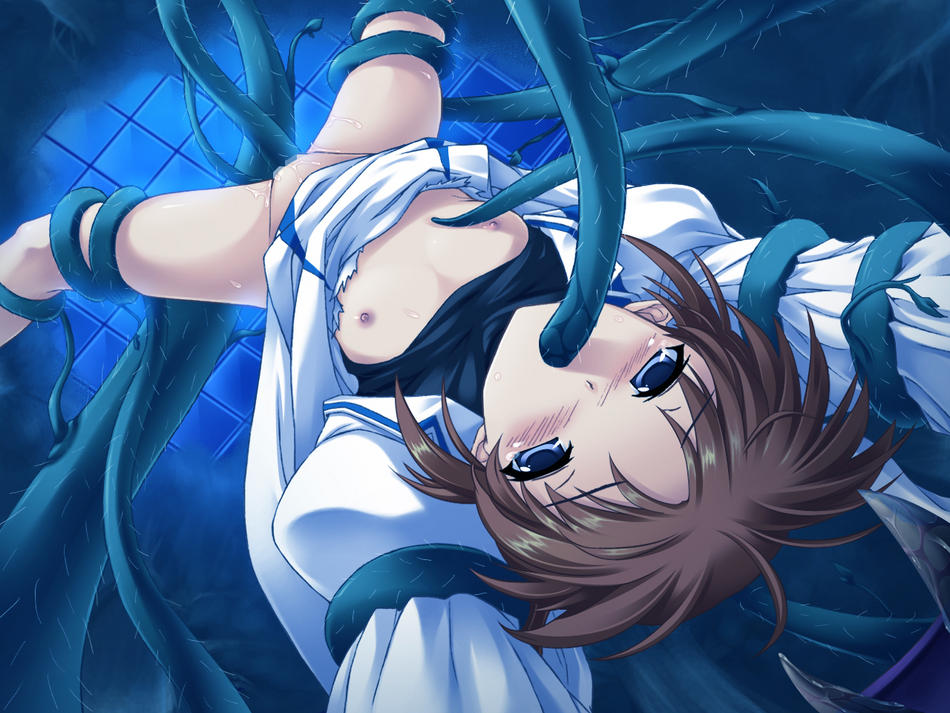 Tags: ambiguous fluidsambiguous penetrationblue eyesbreastsbrown hairdressfemaleflat chesthair ribbonlooking at viewernipplessuspensiontentacletentacles under clothes