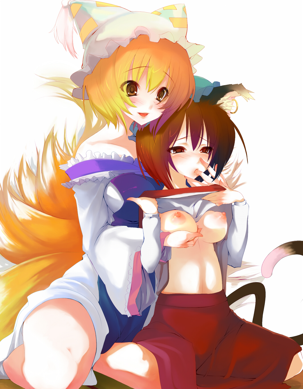 Tags: animal earsblonde hairblushbreast grabbreastsbrown eyesbrown haircat earscat tailfemalefinger in mouthfox earfox tailhatmulti tailmultiple girlsmutual yurinipplesshirt liftshort hairtailyuri