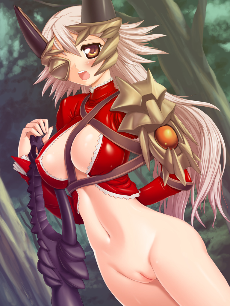 Tags: blushbottomlessbreastscleavage cutouteye patchfemalelong hairmidriffnavelno pantiesopen mouthpussysilver hairsoloyellow eyes