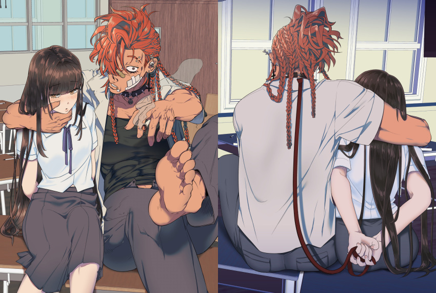 Tags: 1boy1girlsarms behind backartist requestbarefootblushbraidbraided hairbrown haircharacter requestcigaretteclassroomcollarear piercingearringsfeetfemalehand on another's faceimageboardinstant loss 2komaleashlooking at viewermaleoriginaloriginal characterpantspiercingred hairrestrainedRule34school uniformschoolgirlsittingskirtskullsolessource requestspiked collartoesunknown artist