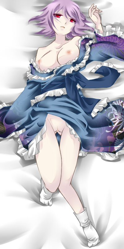 Tags: 1girlsbare shouldersbedbreastsfemalefootwearhal (pixiv53536)japanese clotheskimonolyingnipplesno brano pantiesoff shoulderon backopen mouthpurple hairpussyred eyesshort hairsockssolotabithigh gapthighs