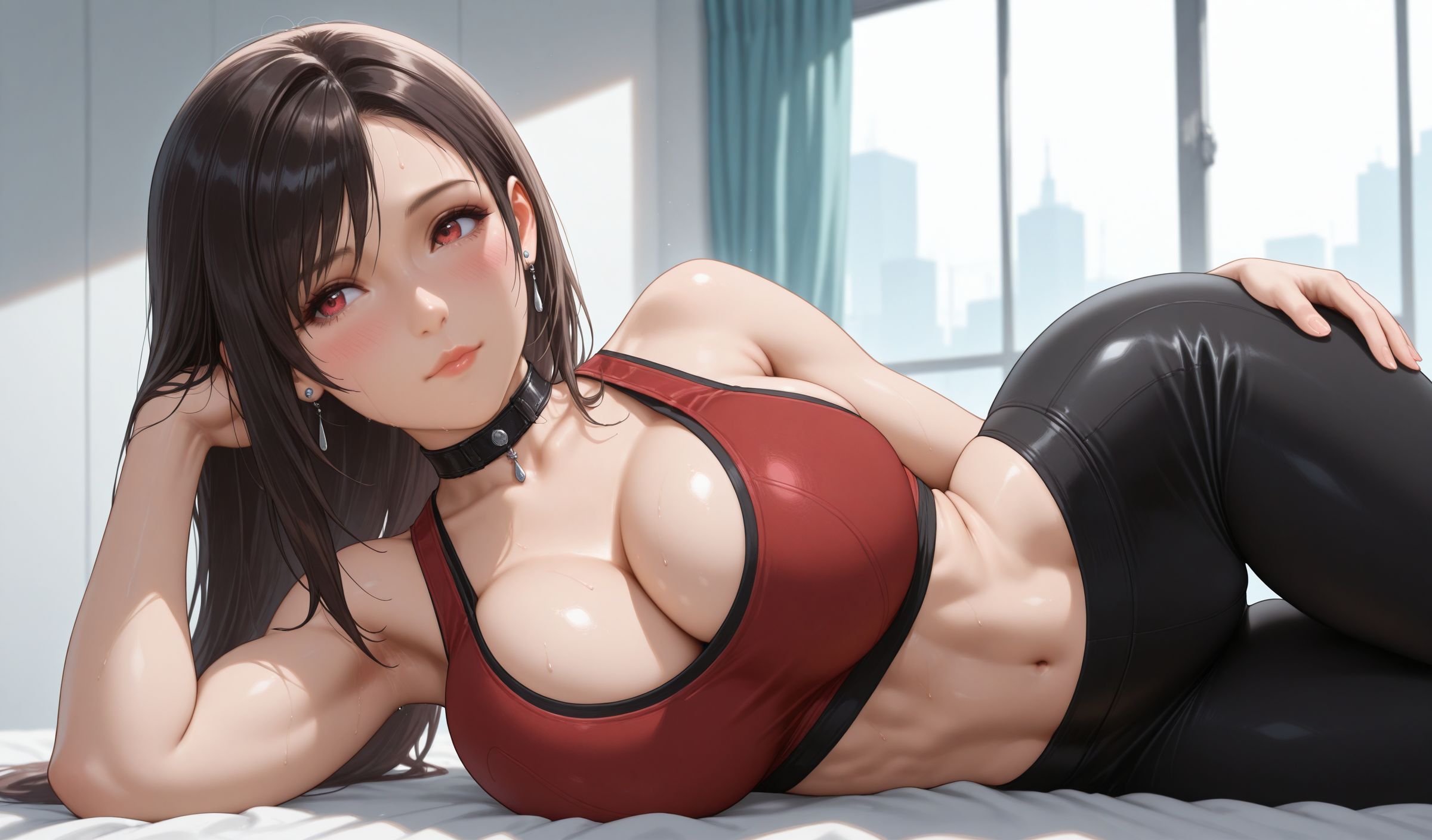 Tags: absbare shouldersblack chokerblack hairblack pantsblushbreastsbrown hairchokercleavageclosed mouthdangle earringsearringselbow restfemaleindoorsjewelrylarge breastslipslong hairlooking at viewerlyingnavelon sidepantsred eyesred sports brasolosports brastomachsweatthigh gaptight clothestight pantswindowyoga pants