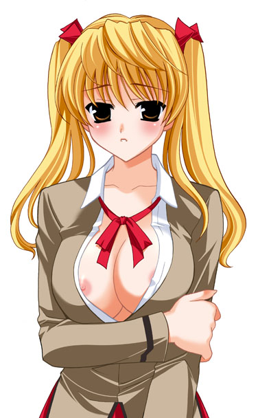 Tags: 1girlsareolaareolaearm grabblonde hairblushbreast holdbreastsbrown eyeserect nipplesfemalelooking at viewernipple slipnipplesopen clothesopen shirtshirtsolotied hairtwintailswhite background