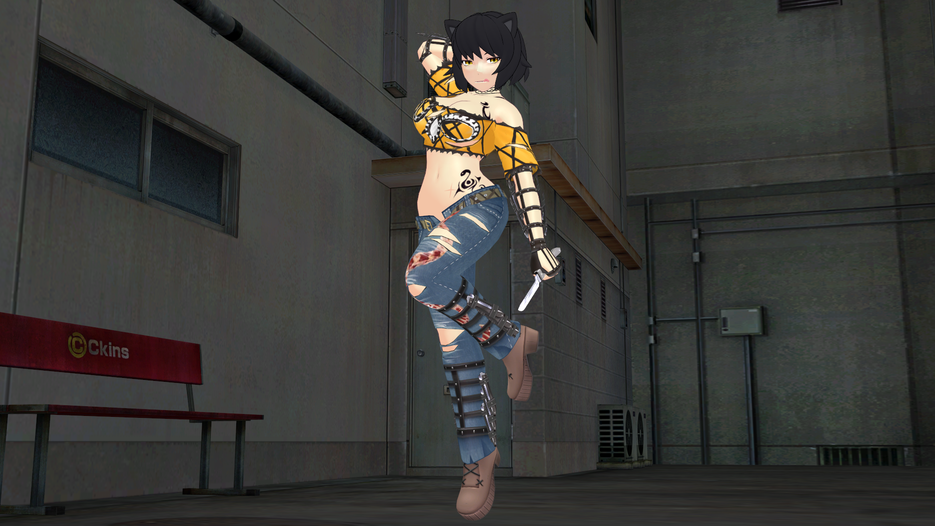 Tags: 1girlsblack hairblack hair femalebreastscat earscleavageclothed femalehalf nakedhalf naked femalehalf-dressedhikage (senran kagura) (cosplay)kniferipped clothingripped pantssolo female